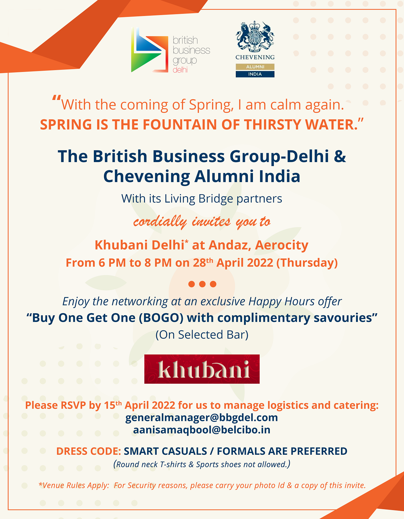 Please RSVP as per attached invite by sharing the details of total number of attendees to the event by 15th April’2022 to the email address mentioned in the invite below, to help us manage catering and logistics accordingly.
