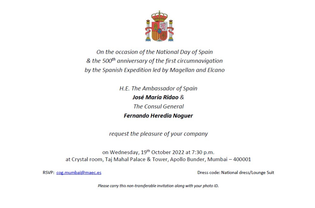 Invitation to ISCC members to join celebration for ‘National Day of Spain & 500th anniversary of first circumnavigation by the Spanish Expedition’ hosted by Mr. José María Ridao, H.E. The Ambassador of Spain, and Mr. Fernando Heredia Noguer, Consul General at Taj Mahal Palace, Mumbai