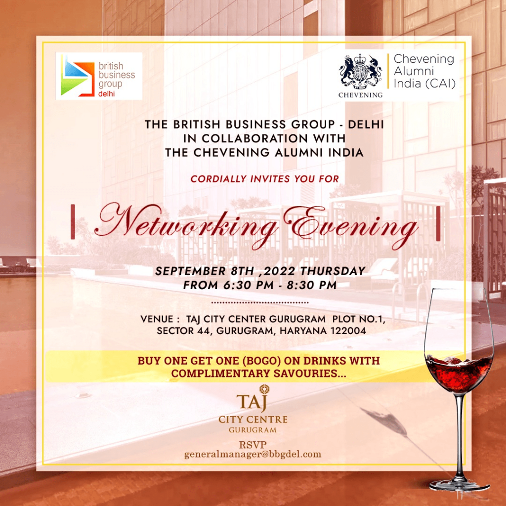 Invitation to ISCC members to networking evening with cocktail at Taj City Centre, Gurugram organised by British Business Group – Delhi in collaboration with the Chevening Alumni in India (CAI)