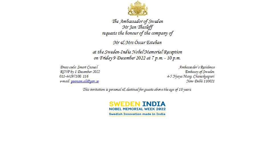ISCC was invited to the Sweden-India Nobel Memorial Reception hosted by Mr. Jan Thesleff, the Ambassador of Sweden at the ambassador’s residence